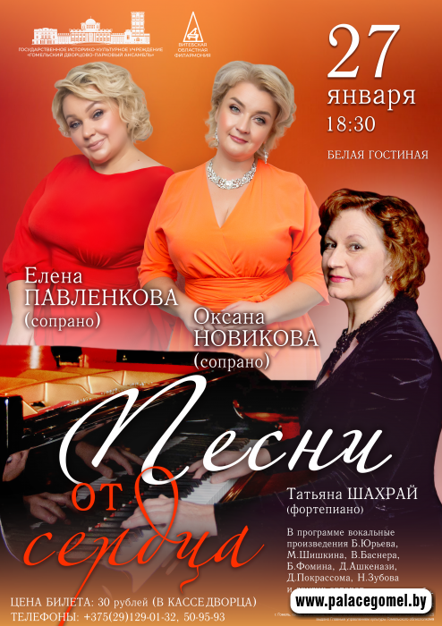|  |  В сказочный зимний вечер приглашаем вас на концерт мастеров сцены Витебской областной филармонии. Оксана Новикова и Елена Павленкова - обладательницы лирического сопрано мягкого серебристого тембра - подготовили для слушателей программу «От сердца к сердцу». Гибкость, техничность исполнения и подвижность голоса позволяют артистам успешно исполнять произведения классиков, композиторов советской эпохи, старинные романсы, народные песни, оперные партии и отрывки из оперетт.