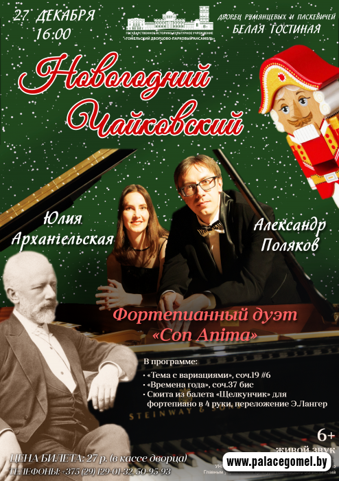 |  |  Чайковский является одним из величайших композиторов мира, ярким представителем музыкального романтизма и одним из выдающихся лириков и драматургов-психологов в музыке. Дорогие друзья! В Белой гостиной дворца Румянцевых и Паскевичей фортепианный дуэт "Сon anima" - молодые и талантливые белорусские пианисты Юлия Архангельская и Александр Поляков представят новую концертную программу «Новогодний Чайковский», посвященную 185-ти летию композитора.