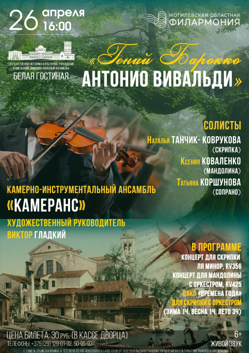 Концертная программа «Гений Барокко. Антонио Вивальди»Ансамбль «КамерАнс» и солисты Могилевской областной филармонии приглашают Вас на яркий весенний концерт «Гений Барокко. Антонио Вивальди», чтобы насладиться прекрасной музыкой, погрузиться в волшебство весны и зарядиться энергией, и позитивом. Программа наполнена радостью, добром и любовью.