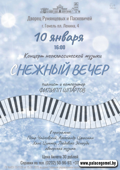 10 января в Белой гостиной дворца Румянцевых и Паскевичей состоится концерт «СНЕЖНЫЙ ВЕЧЕР».