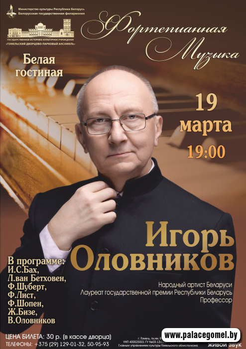 В программе прозвучит музыка: Т. Альбинони, М.К.Огинского, Л.Бетховена, М. Глинки, Ф. Шопена, П.И. Чайковского, И. Лученка.Виртуозная исполнительская техника, яркая образность музыкального мышления, строгая архитектоника музыкальной формы и мягкая манера интонирования определяют индивидуальный пианистический стиль музыканта. Свои выступления Игорь Оловников часто сопровождает собственными комментариями к произведениям, которые подаются в форме непосредственной и увлекательной беседы со слушателем. Приглашаем гомельчан и гостей города в мир классической фортепианной музыки, на встречу с мэтром музыки Игорем Оловниковым. Дата и время проведения: 19 марта в 19.00. БИЛЕТОВ НЕТ! |
