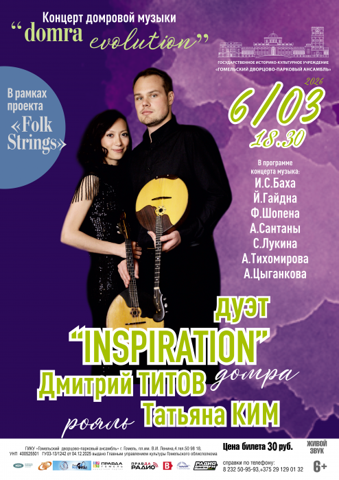 Концертная программа лауреатов международных конкурсов Татьяны Ким и Дмитрия ТитоваВ рамках проекта "Folk Strings" концерт домровой музыки "Domra Evolution" Дуэт "Inspiration".