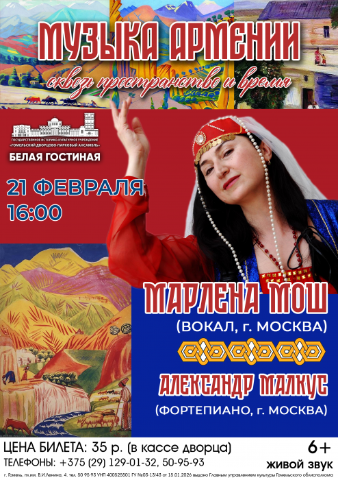 Концертная программа «Музыка Армении сквозь пространство и время»Певица и поэтесса, собиратель и исполнитель древних армянских мелодий Марлена Мош и известный пианист Александр Малкус представляют программу «Музыка Армении сквозь пространство и время».
