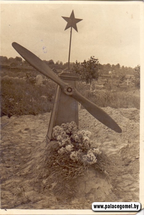 Первый памятный знак в Гомеле был установлен еще до оккупации областного центра гитлеровцами (фото 1). 2 августа 1941 года в районе студенческого сквера был похоронен летчик Смирнов Петр Григорьевич (фото 2), уроженец Калининской области, старший политрук, военный комиссар эскадрильи 66-й корпусной авиаэскадрильи, погибший в одном из оборонительных боев за Гомель 30 июля 1941 года.