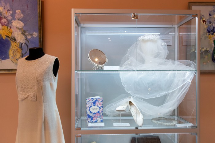 На выставке представлены и другие предметы советской свадебной моды -джульетка, фата, туфли. Они бытовали в семье гомельчанки А. Исакович. К слову, в декабре 2026 г. в рамках Года белорусской женщины во дворце планируется открытие выставочного проекта «Я - невеста», посвященного особенностям свадебной культуры на Гомельщине в ХХ в. Вещи и воспоминания отдельных женщин разных возрастов позволят создать образы девушек-невест в разные десятилетия прошлого века. Если у вас сохранились свадебные платья и атрибуты к ним, фотографии, документы, связанные с этим торжеством, особые воспоминания или интересные свадебные традиции - ждем вас в музее!