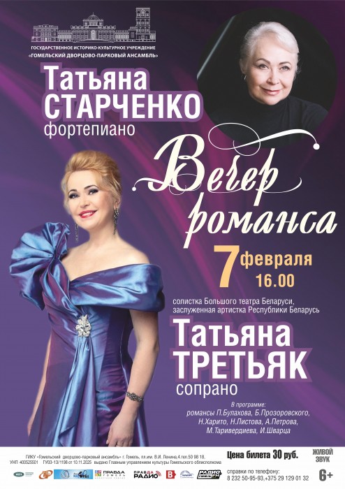 Известная белорусская пианистка Татьяна Старченко представляет программу «Вечер романса» к юбилею заслуженной артистки Республики Беларусь, солистки Большого театра Беларуси - Татьяны Третьяк. Татьяна Третьяк и Татьяна Старченко- концертный дуэт, долгие годы работающий вместе и представивший слушателям огромное количество самых разнообразных программ. «Вечер романса» - одна из самых любимых! Старинные, городские, «жестокие» и современные - все эти романсы о встречах и расставаниях, потерях и страданиях, настоящей любви и обмане. В исполнении заслуженной артистки Республики Беларусь Татьяны Третьяк (сопрано) прозвучат известные романсы второй половины XIX - середины XX вв. Исполнение настоящих мастеров этого жанра доставят подлинное наслаждение ценителям особенного стиля «мини спектакля», где за несколько минут возможно проследить историю любви, а порой и всей жизни... В программе романсы Н. Листова, Б. Прозоровского, Б. Фомина, Н. Харито, А. Кошевского, Я. Пригожего, И. Шварца, А. Петрова, М. Таривердиева. Слушателям подарит искреннюю радость и беззаботное счастье романс «Моя душечка» А. Дюбюка, «Белая ночь» Б. Тимофеева, «Не исчезай» и «Музыка» М. Таривердиева, на стихи А. Вознесенского и В. Орлова, «В нашем старом саду» И. Шварц, слова Б. Окуджавы, - романсы, которые не только завораживают и вдохновляют, а обладают поистине целительной силой. Вас ждут и вам всегда рады в Белой гостиной дворца Румянцевых и Паскевичей. Дата и время проведения: 7 февраля в 16.00. |